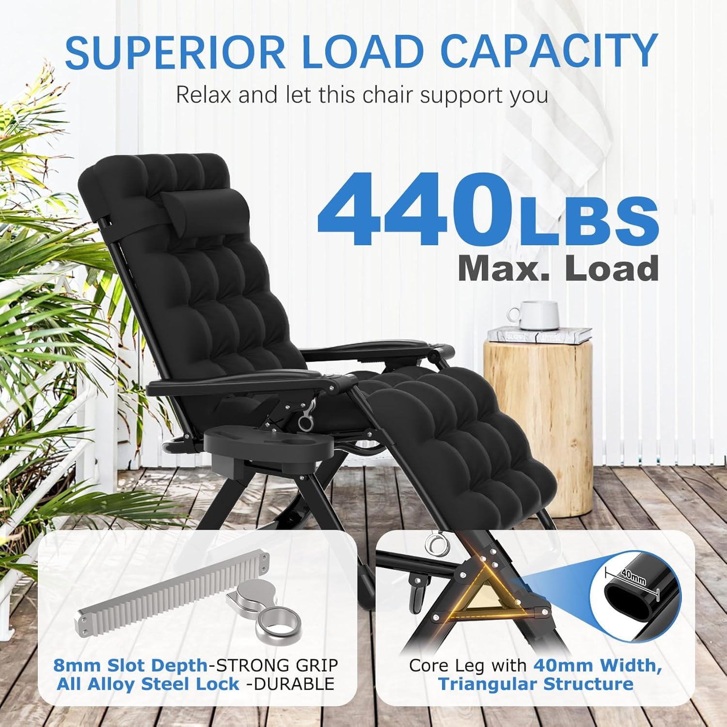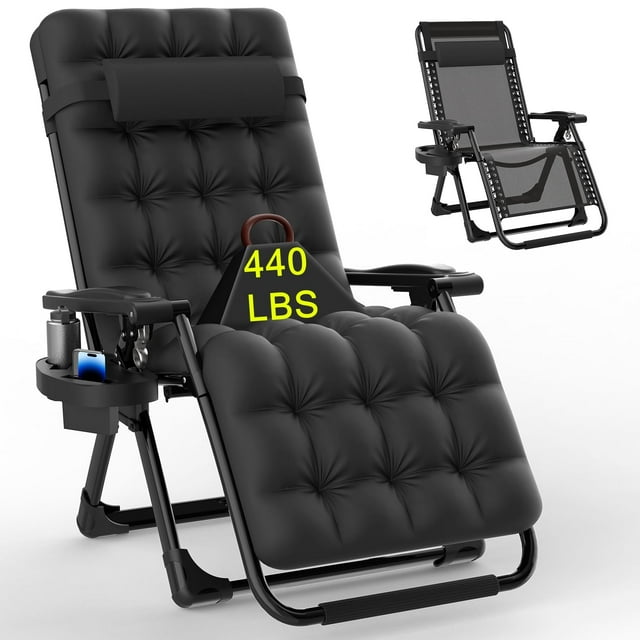 Suteck foldable portable 26-inch zero-gravity lounge chair, suitable for indoor use, with a maximum capacity of 440 pounds. It adopts 40mm thick steel pipes and is very suitable for outdoor use. Upgrade Texlin fabric, double elastic band, breathable mesh, detachable cushion to enhance comfort.