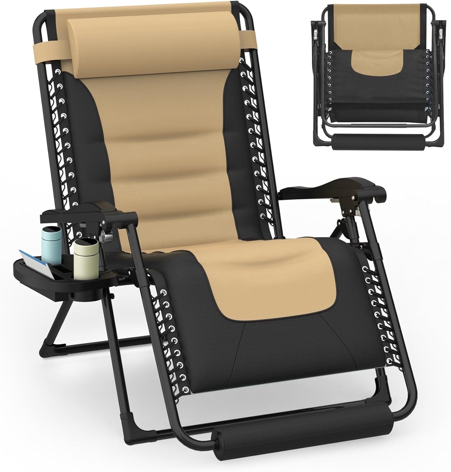 Suteck 29" XL 300lbs Oversized Padded Zero Gravity Chair Reclining Camping Lounge Chair with Large Cup Holder & Footrest, Reclining Patio Chairs, Folding Recliner Chair for Outdoor Indoor, Khaki
