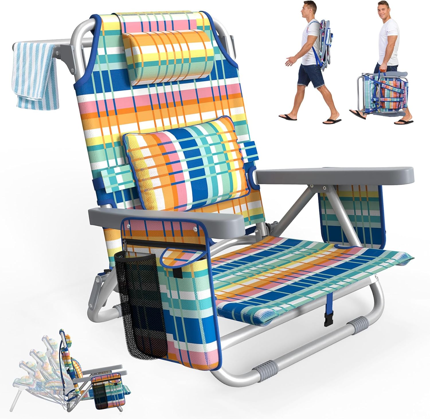 Suteck Beach Chair, Adjustable 5-Position Backpack Beach Chairs for Adults Kids, Reclining Beach Chair with Cooler Bag, Cup Holder and Lumbar Pillow, Foldable Lay Flat Chair for Beach Lawn Outdoor Rainbow