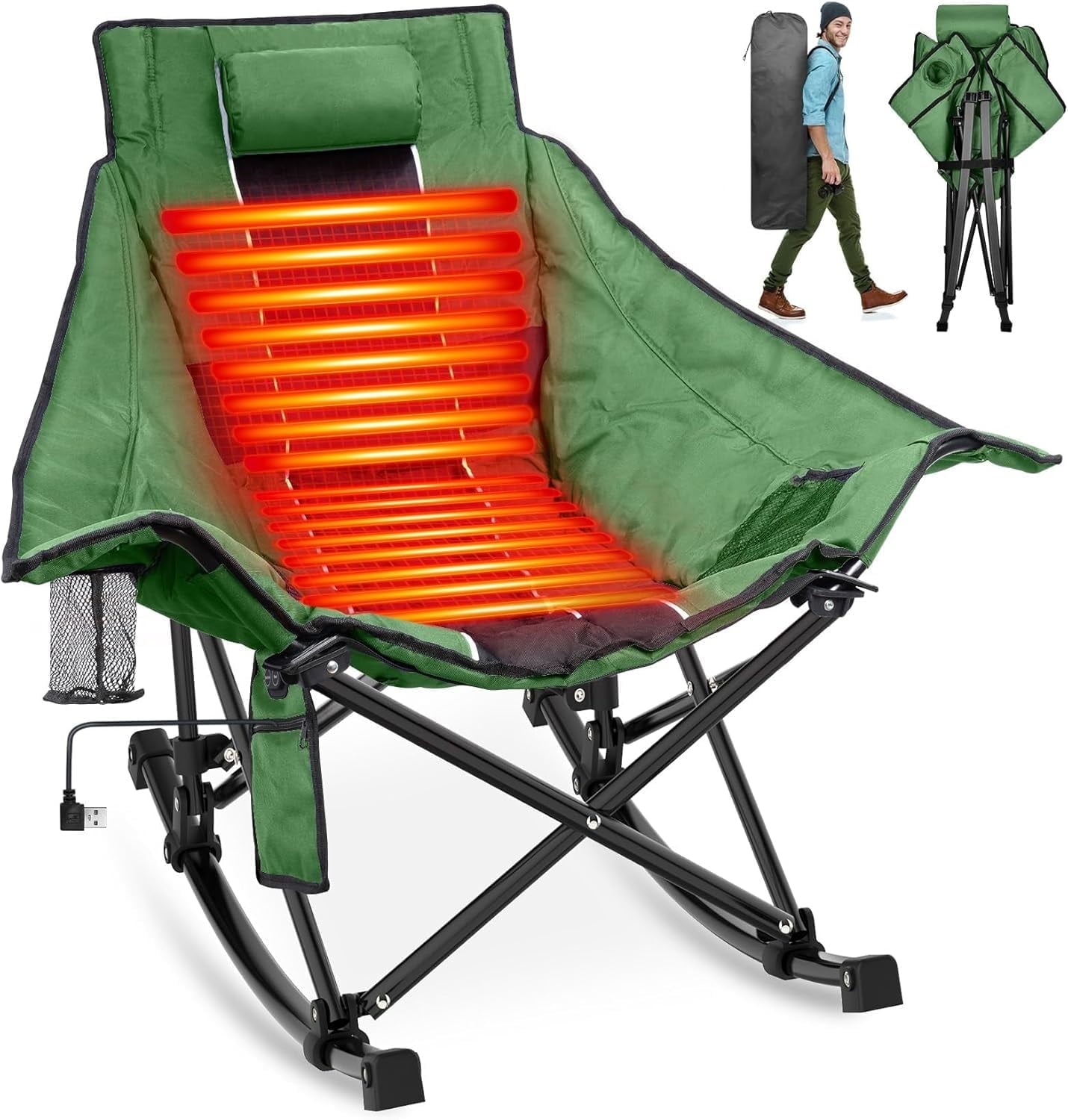 Suteck Heated Camping Chair, Oversized Outdoor Rocking Chair with 3 Heat Levels, Portable Folding Heated Chair for Camp, Lawn, Sports, Winter Use (Battery NOT Included)
